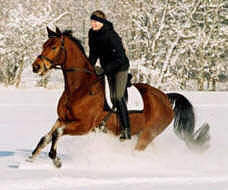 Uslar 5.März 2005 - bei herrlichem Winterwetter fand auf dem Eichenhof in Uslar der Freispringwettbewerb des Trakehner Zuchtbezirkes Niedersachsen statt. Unser 4-jähriger Prämienhengst "Shavalou" belegte mit der Note 8,3 den 3. Platz. |