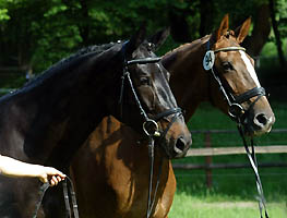Ganschow - 15. Mai 2010 - Anlässlich der heutigen zentralen Stuteneintragung des Zuchtbezirkes Neue Bundesländer-Nord, im mecklenburgischen Ganschow, wurde die Summertime-Tochter BALALAIKA LE FAY aus der Berceuse II v. Caprimond mit 54,5 Punkten eingetragen und damit zur Verbandsprämie vorgeschlagen. Herzlichen Glückwunsch der Züchterin Dr. Marliese Dobberthien und der neuen Besitzerin Angelika Langsdorf. |