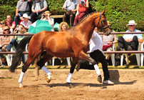 Springvermögen sehr zu überzeugen! Unser Hämelschenburger Spitzenvererber Saint Cyr stellte mit seinem Sohn High Quality, aus der Zucht von Luise Bredemeyer, Petershagen, seinen 6. gekörten Sohn. Aus der Hengstlinie unserer Hämelschenburger Vererberlegende Kostolany stammt zudem der diesjährige Siegerhengst! Saint Cyr's Sohn Greenwich Park a.d. Pr., StPr. u. Elitestute Grace Note v. Alter Fritz (Züchter: Bernhard Langels, Bes.: J.v.Rönne) war zudem Preisspitze der diesjährigen Reitpferdekollektion - er wurde für EUR 130.000,-- nach Österreich verkauft! Unser 3jähriger Mount Saint-Cyr - von Kimberly Hinrichs sehr schön und altersgemäß vorgestellt - wurde leider nicht gekört. | ![]() |
