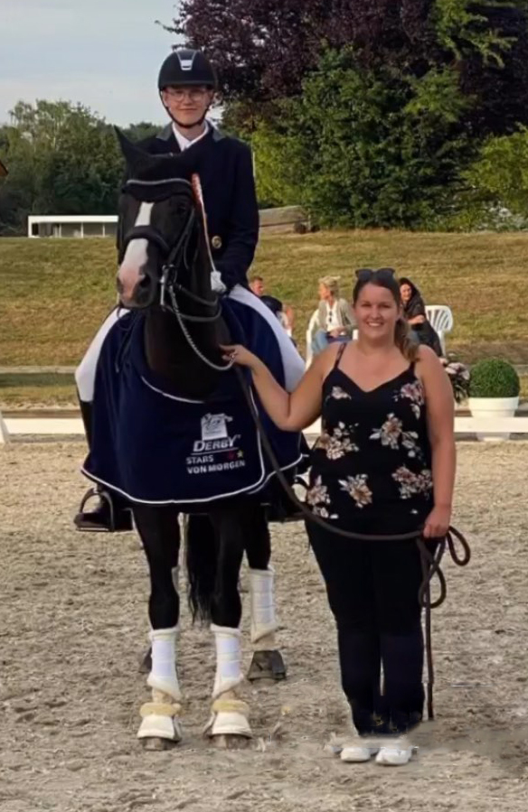 Langenfeld - 16. Juni 2022 - Im Rahmen der Rheinischen Meisterschaften findet das Finale der „Derby Stars von Morgen“ in Münster statt. Niklas Brokamp und der gekörte Trakehner Hengst GREENWICH PARK von Saint Cyr u.d. Pr.,StPr.u. Elitestute Grace Note v. Alter Fritz (Züchter: Bernhard Langels, Besitzerin: Ulrike Gasser) sicherten sich den ersten gemeinsamen S***-Sieg mit 70,842 Prozent! | ![]() |