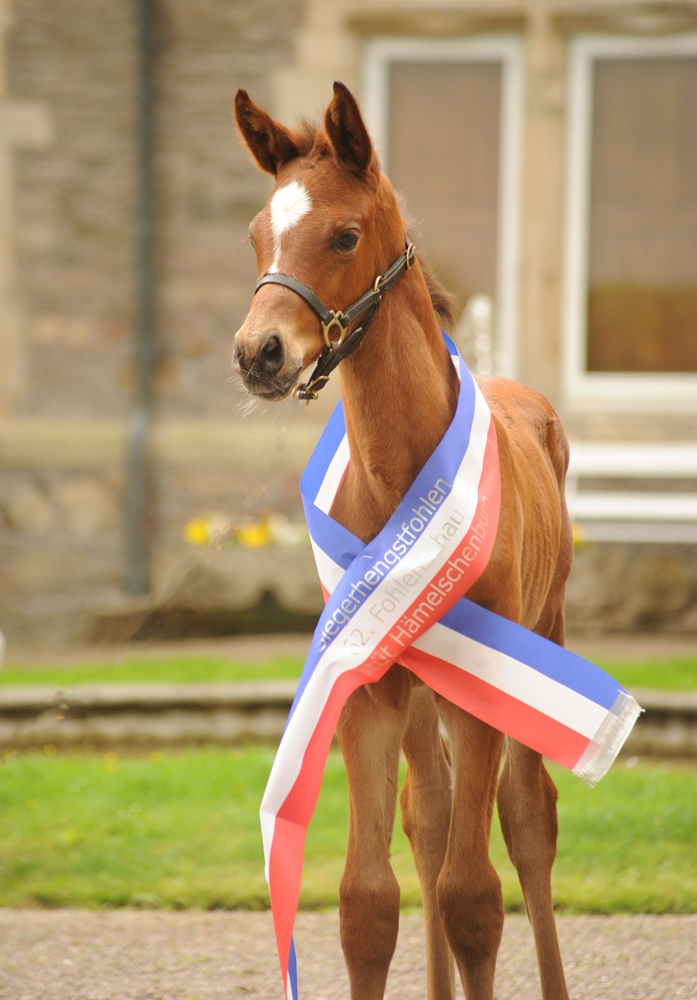 Die Siegerschärpe bei den Hengstfohlen sicherte sich ein Sohn des 4* erfolgreichen Glücksruf aus der Prämienanwärterin Schwalbe's Beauty v. High Motion aus der Zucht des Gestüt Hämelschenburg.